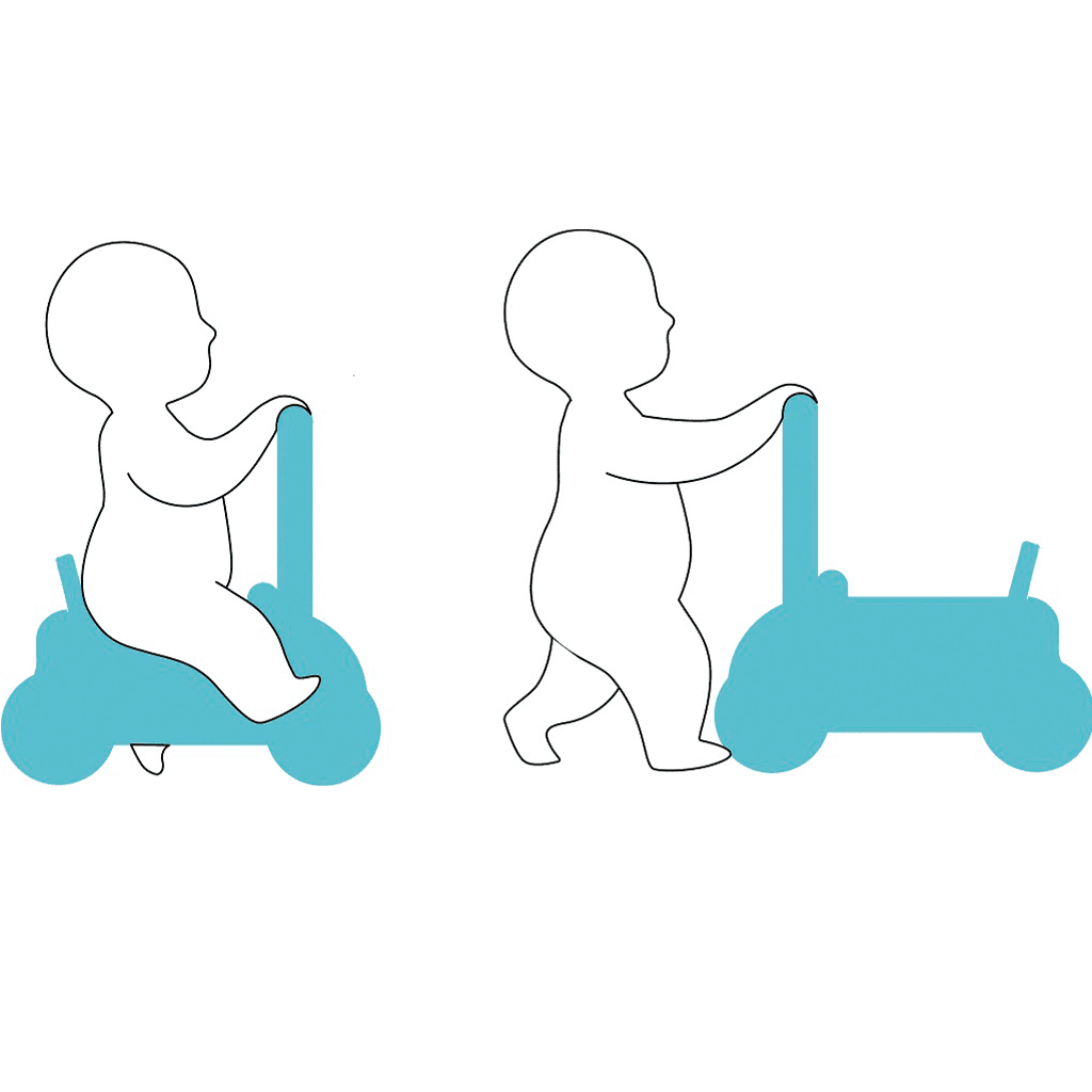 Na bocích vozítka jsou otvory pro vkládání dřevěných tvarů, díky nimž si děti procvičují prostorovou představivost a jemnou motoriku. Vozítko je stabilní a bezpečné. Na levé straně jsou umístěny otočné barevné válce a pod opěradlem barevné otočné trojúhelníky. Sedací plocha je navíc vybavena klaksonem se zvukovými efekty.
