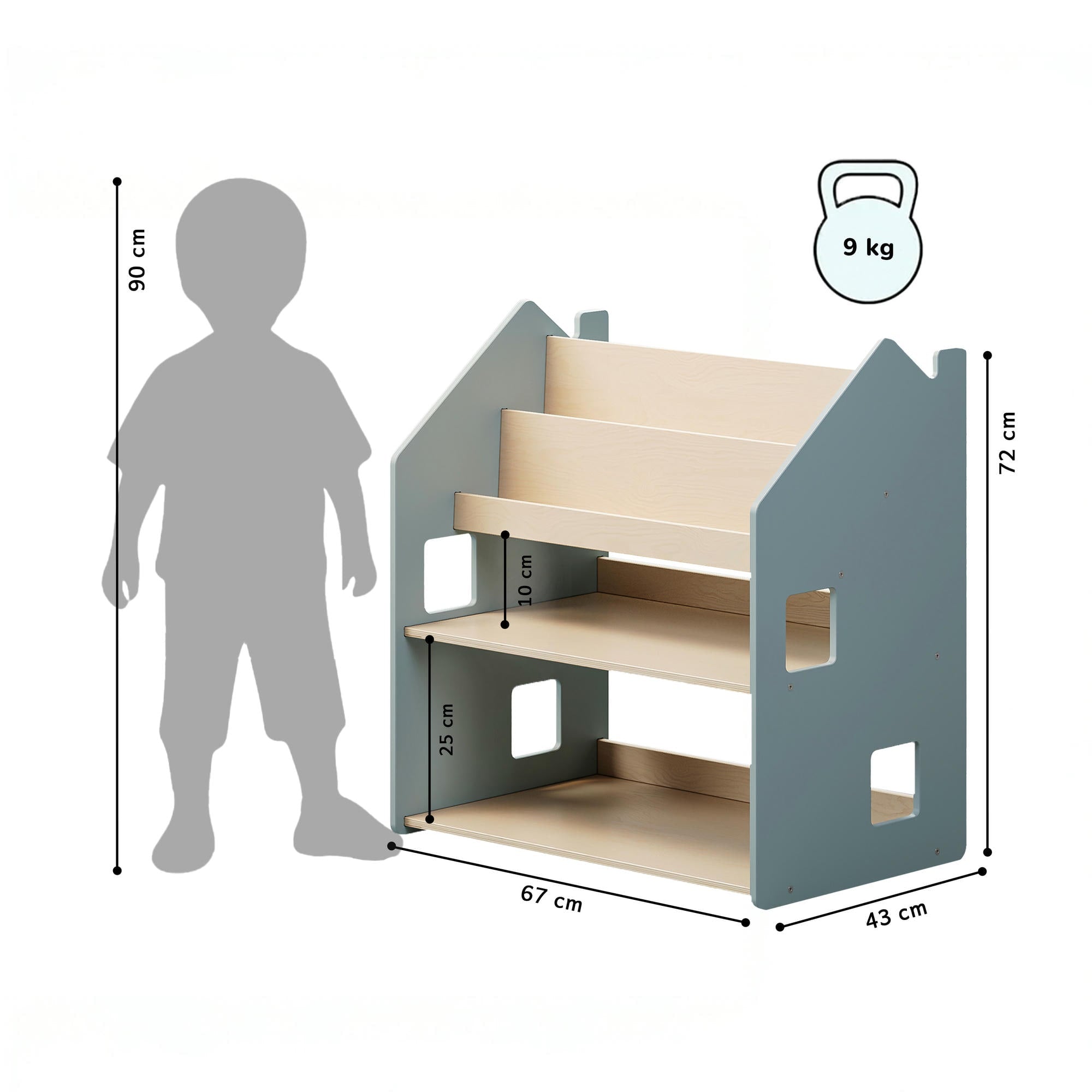 Obsahuje čtyři prostorné police a zadní úložný prostor, kam lze pohodlně uložit knihy, hračky či jiné drobnosti. Díky otevřenému uspořádání má dítě snadný přístup ke všem věcem a postupně se učí udržovat pořádek.