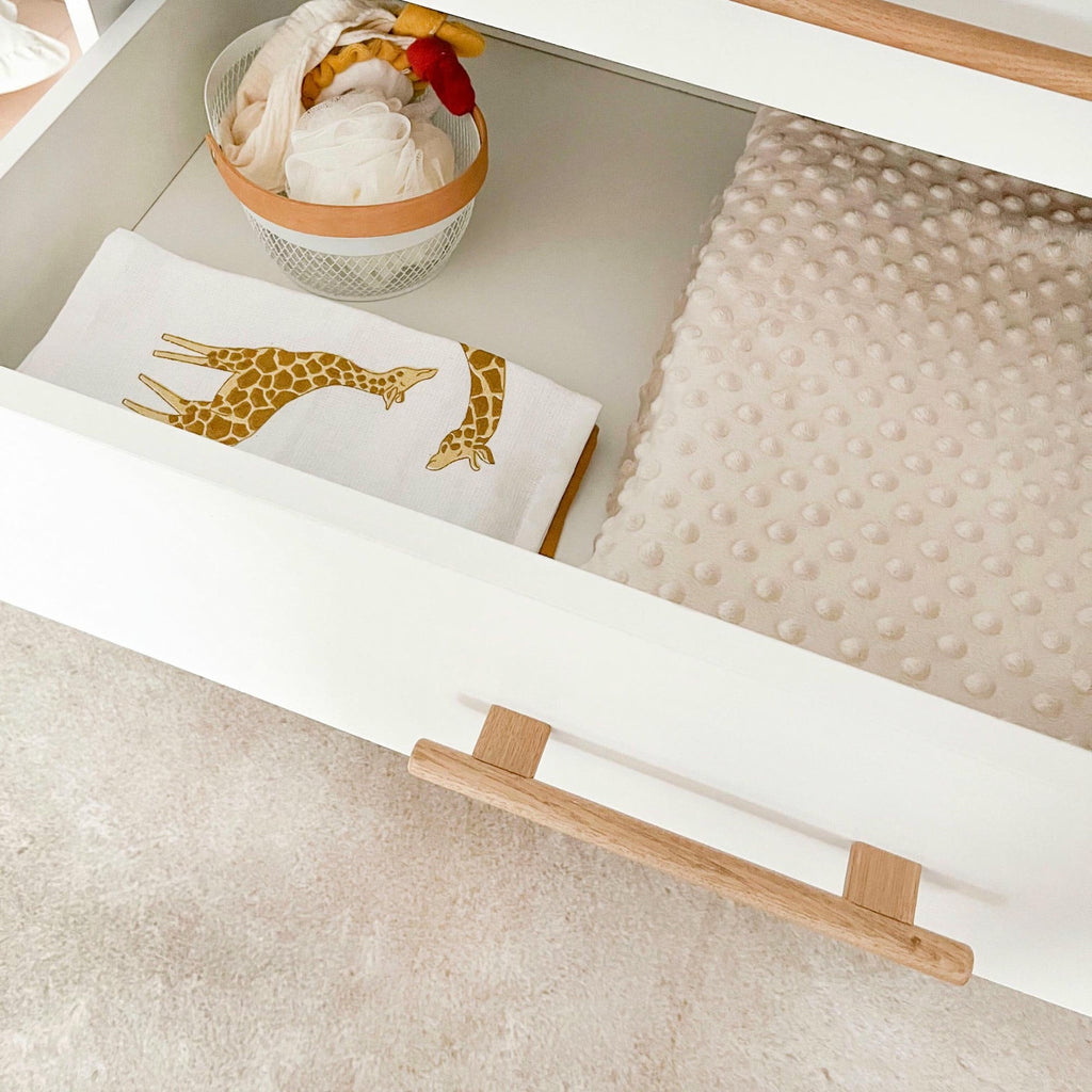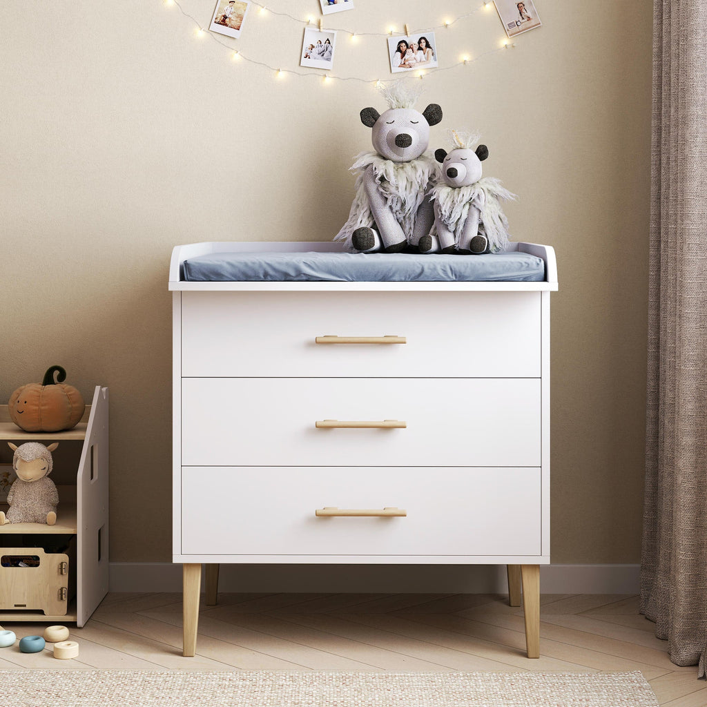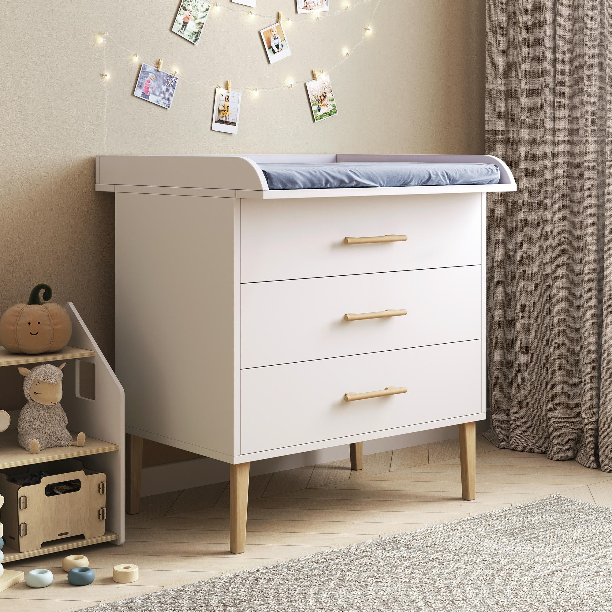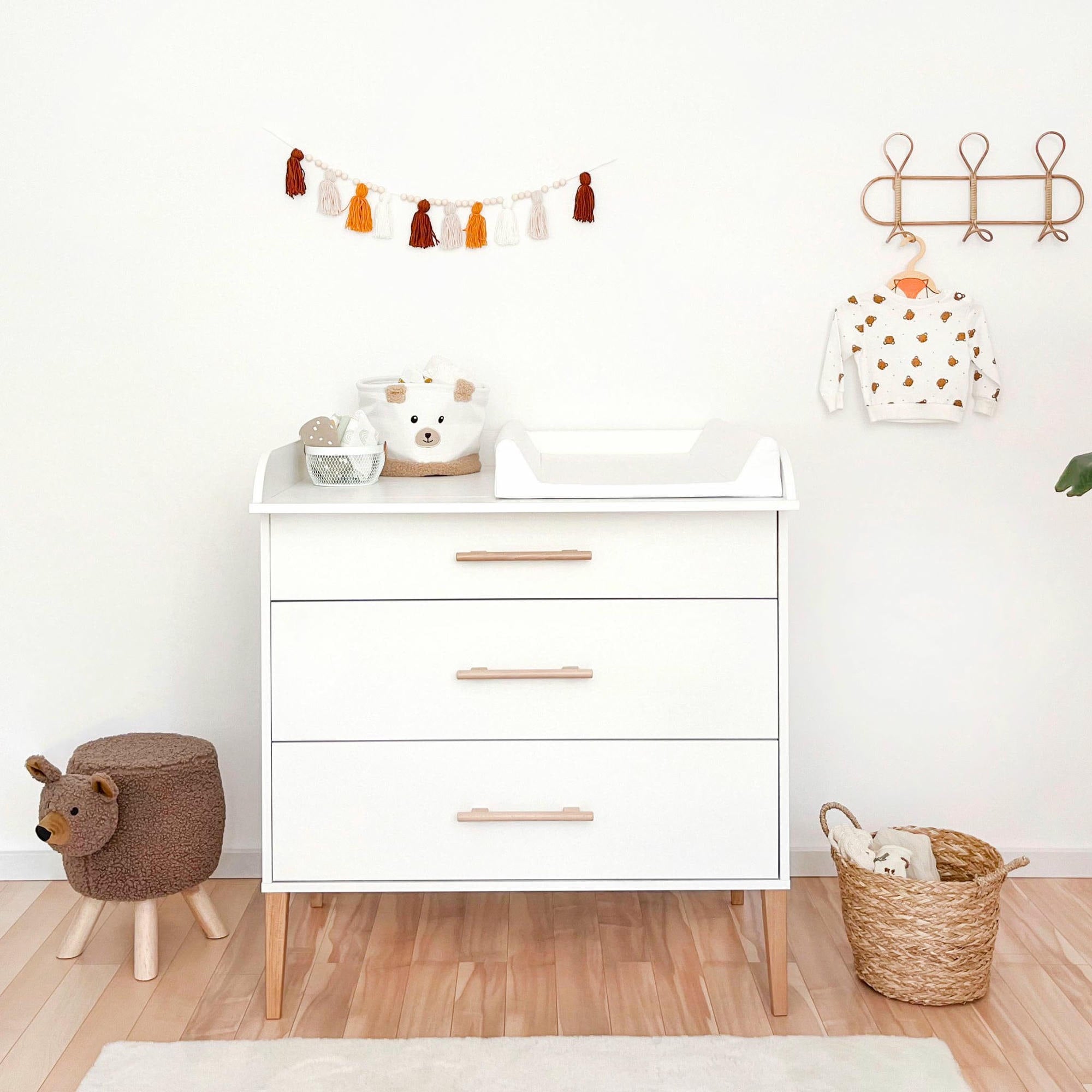 Komoda je vybavena třemi prostornými zásuvkami, které poskytují dostatek místa pro plenky, oblečení a potřeby pro péči o dítě. Přebalovací pult lze v případě potřeby snadno odejmout, což umožňuje flexibilně přizpůsobit nábytek měnícím se potřebám rodiny. Elegantní dřevěné úchyty dodávají komodě osobitý charakter a podtrhují její harmonický a atraktivní vzhled.