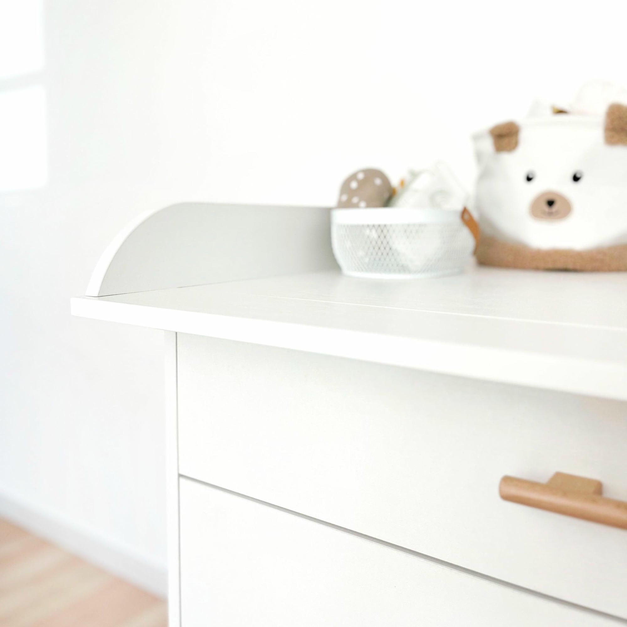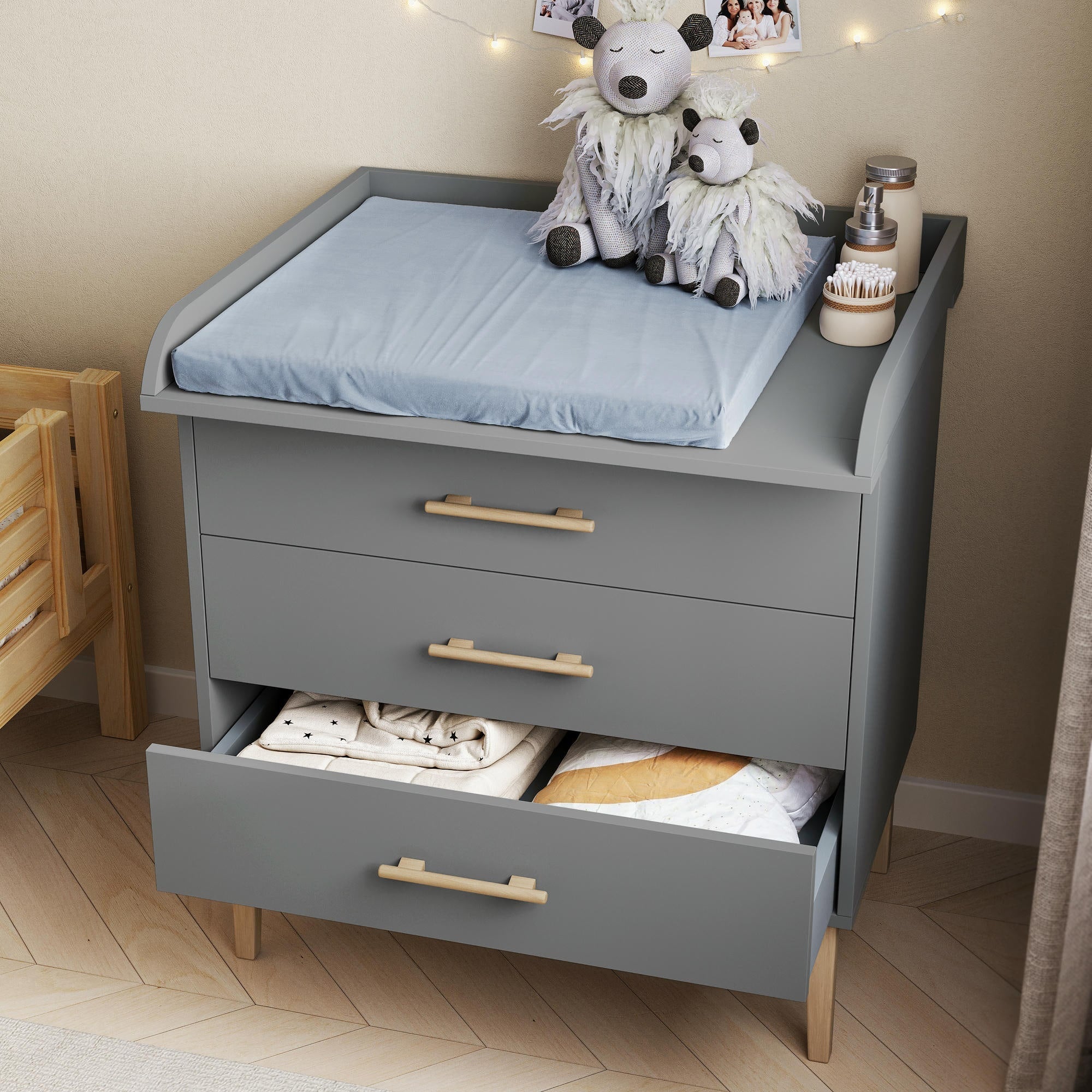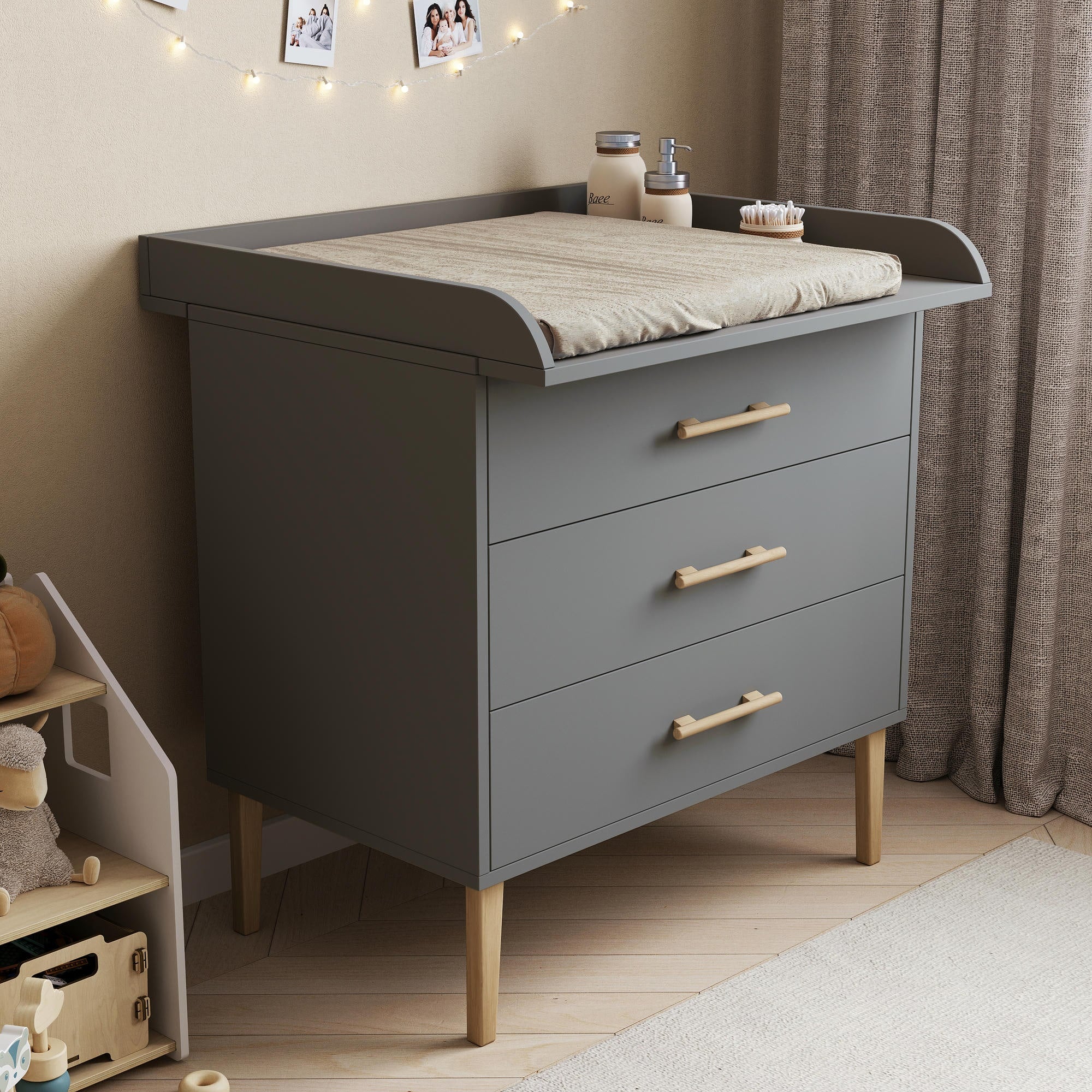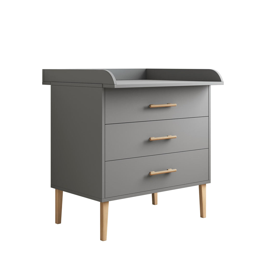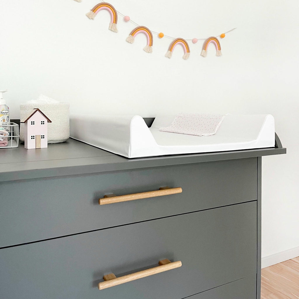 Komoda je vybavena třemi prostornými zásuvkami, které poskytují dostatek místa pro plenky, oblečení a potřeby pro péči o dítě. Přebalovací pult lze v případě potřeby snadno odejmout, což umožňuje flexibilně přizpůsobit nábytek měnícím se potřebám rodiny. Elegantní dřevěné úchyty dodávají komodě osobitý charakter a podtrhují její harmonický a atraktivní vzhled.