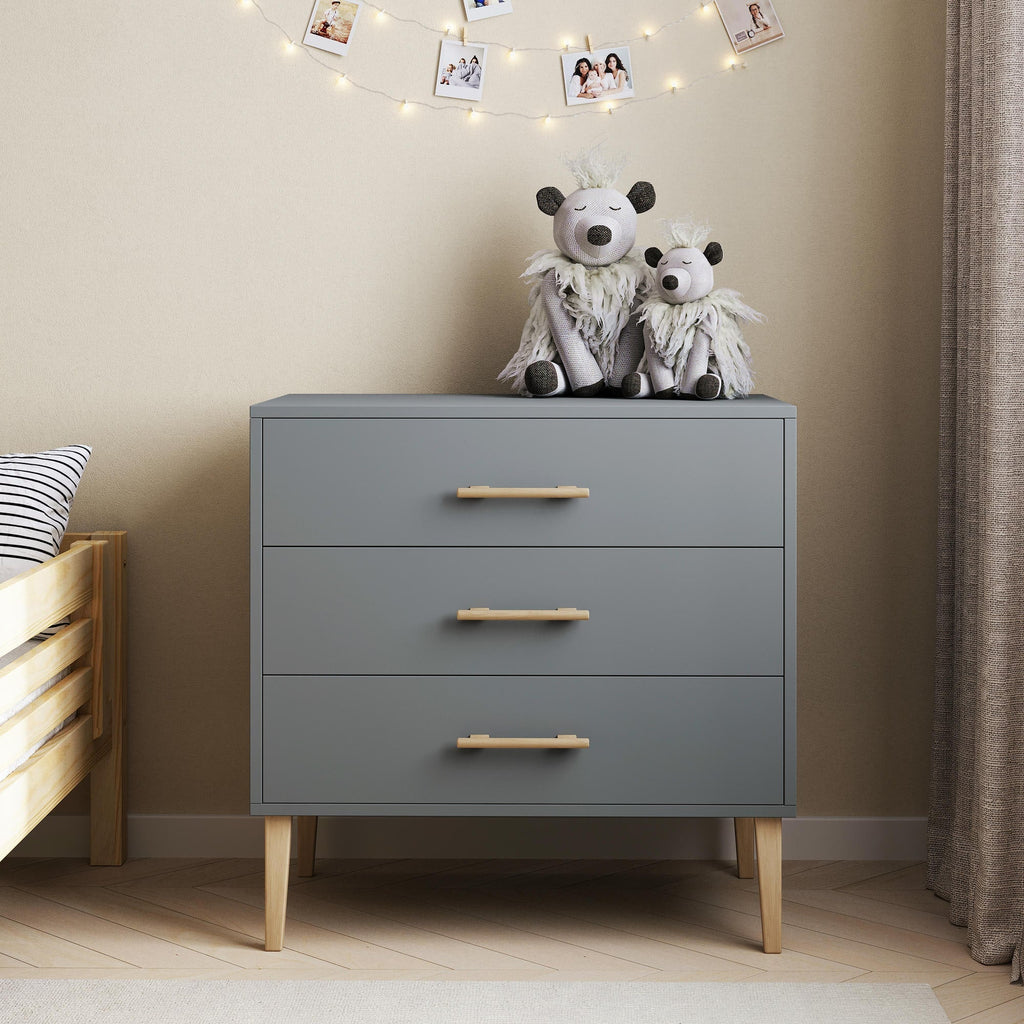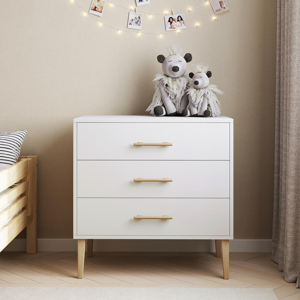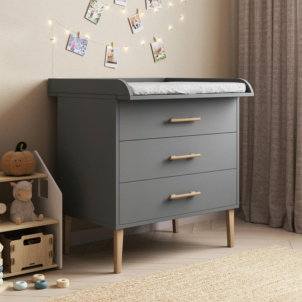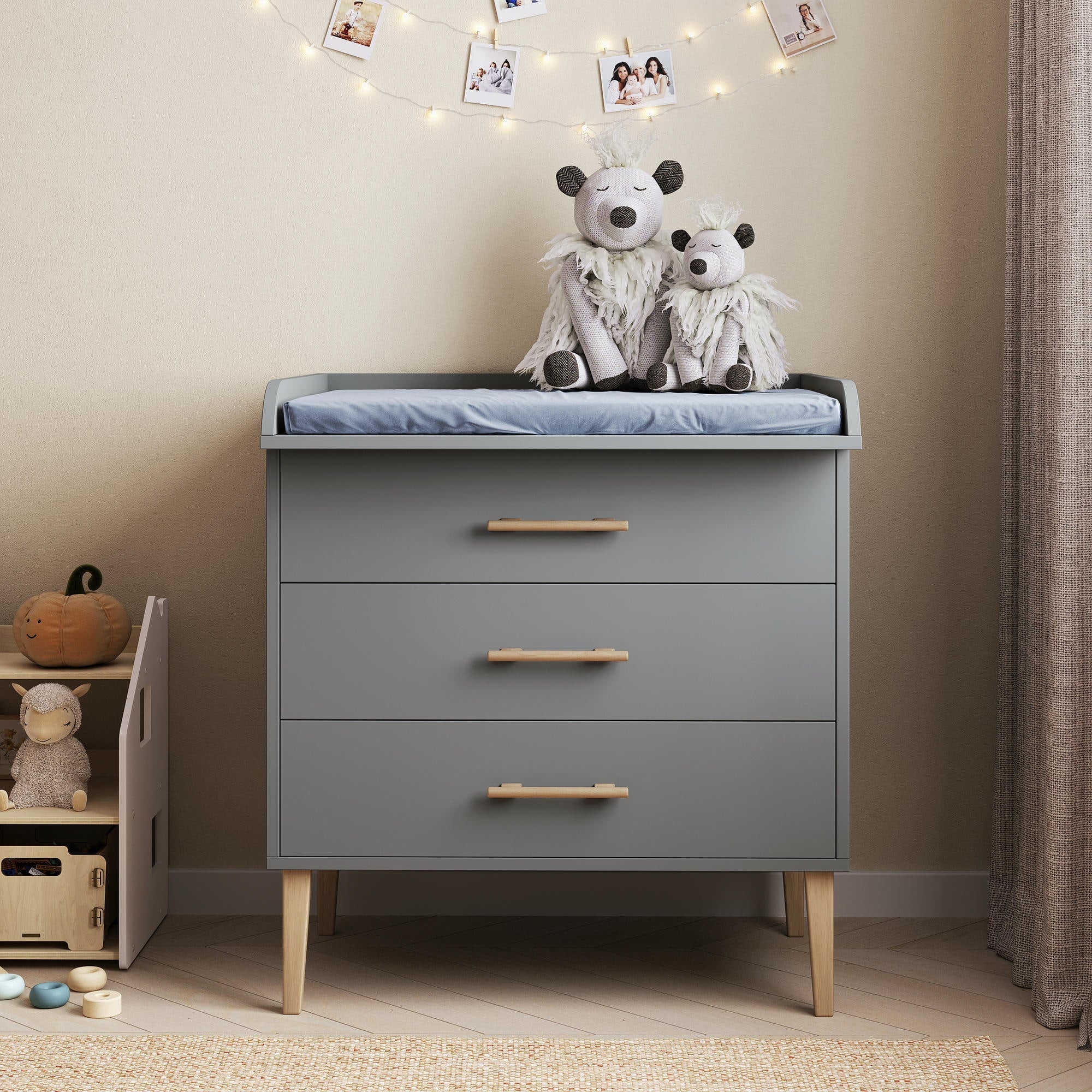 Komoda je vybavena třemi prostornými zásuvkami, které poskytují dostatek místa pro plenky, oblečení a potřeby pro péči o dítě. Přebalovací pult lze v případě potřeby snadno odejmout, což umožňuje flexibilně přizpůsobit nábytek měnícím se potřebám rodiny. Elegantní dřevěné úchyty dodávají komodě osobitý charakter a podtrhují její harmonický a atraktivní vzhled.