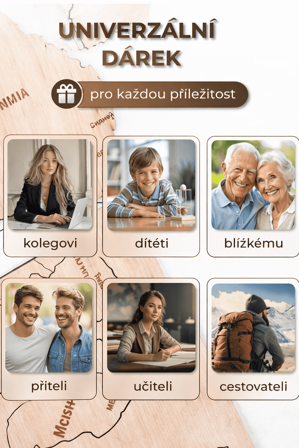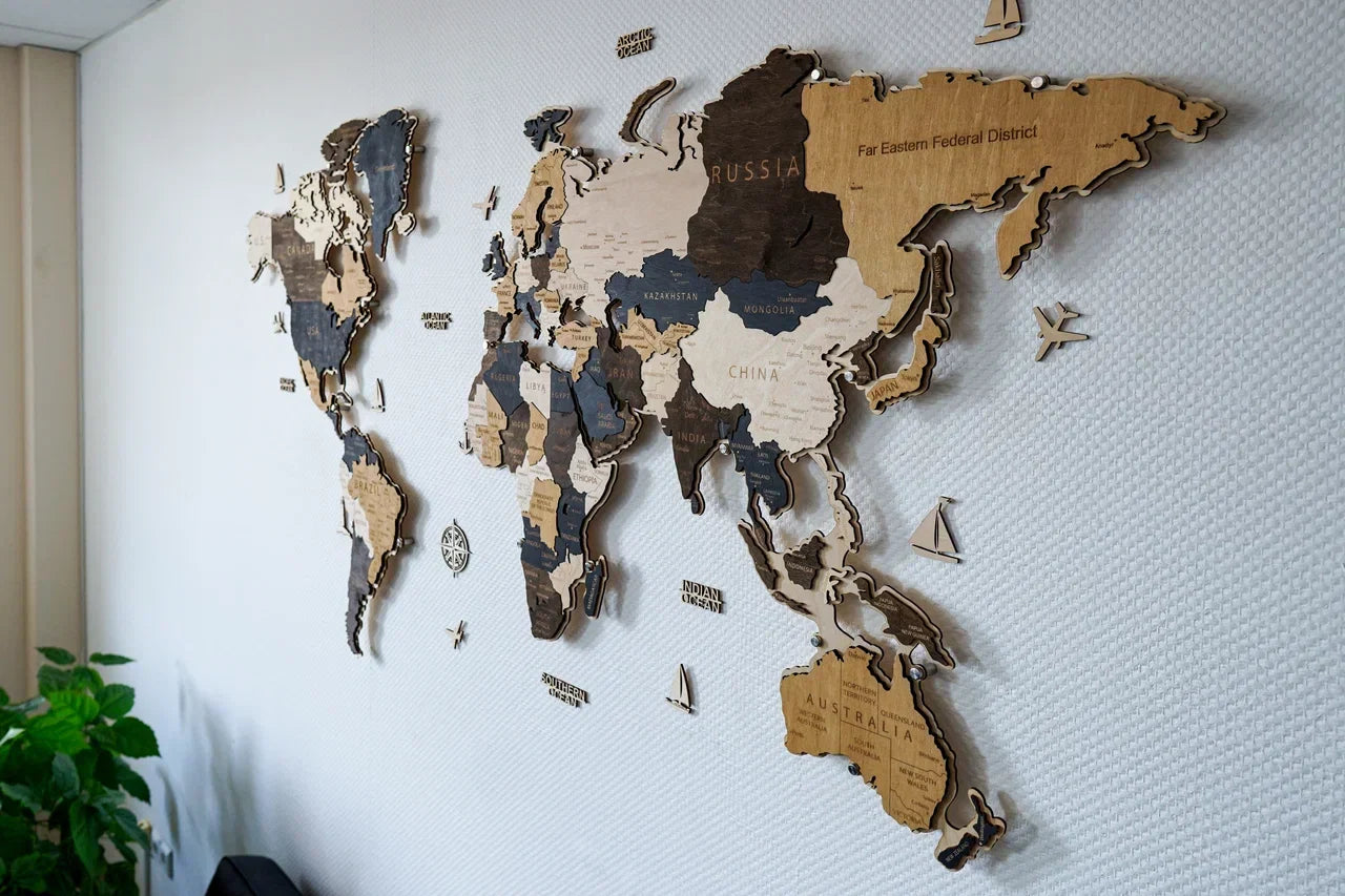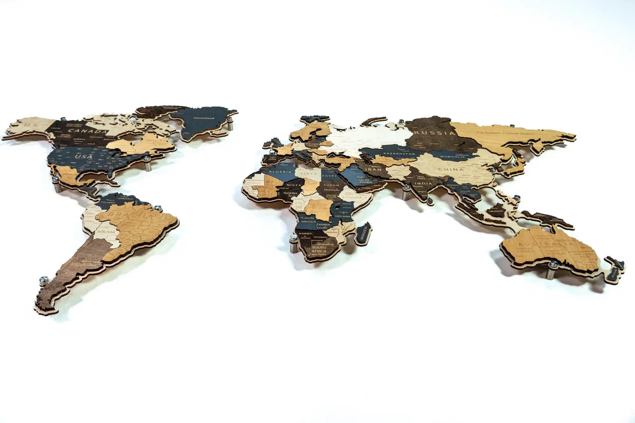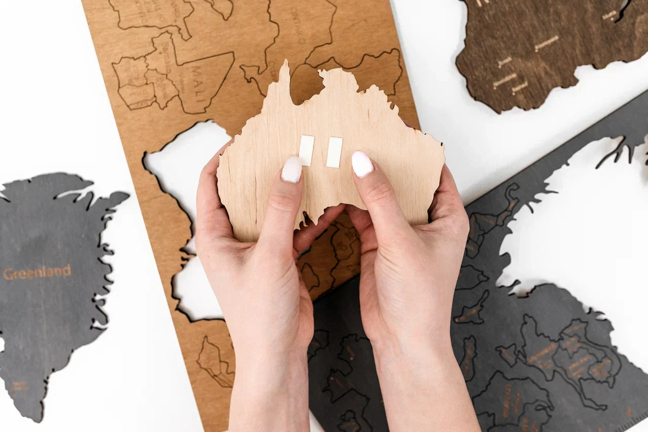 Mapa pomáhá dětem objevovat geografii, rozšiřovat jejich obzory i fantazii a hravou formou poznávat kontinenty, země a oceány. Trojrozměrné dřevěné prvky dodávají produktu hloubku a činí jej pro děti mimořádně atraktivním.
