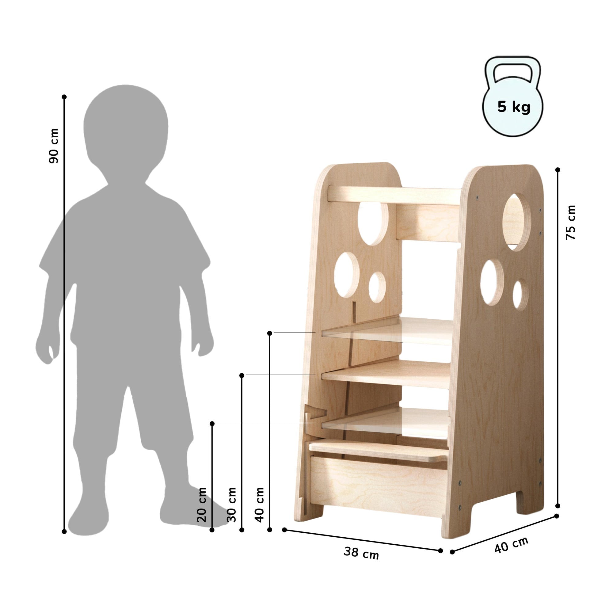 Učební věž pomáhá batolatům i předškolním dětem objevovat svět kolem sebe. Věž je vysoká 75 cm a díky nastavitelné platformě nabízí tři výškové úrovně, aby dítěti sloužila co nejdéle. Boční stěny jsou dostatečně vysoké a zdobené otvory ve tvaru bublinek, které děti mohou využívat při lezení nahoru nebo dolů.