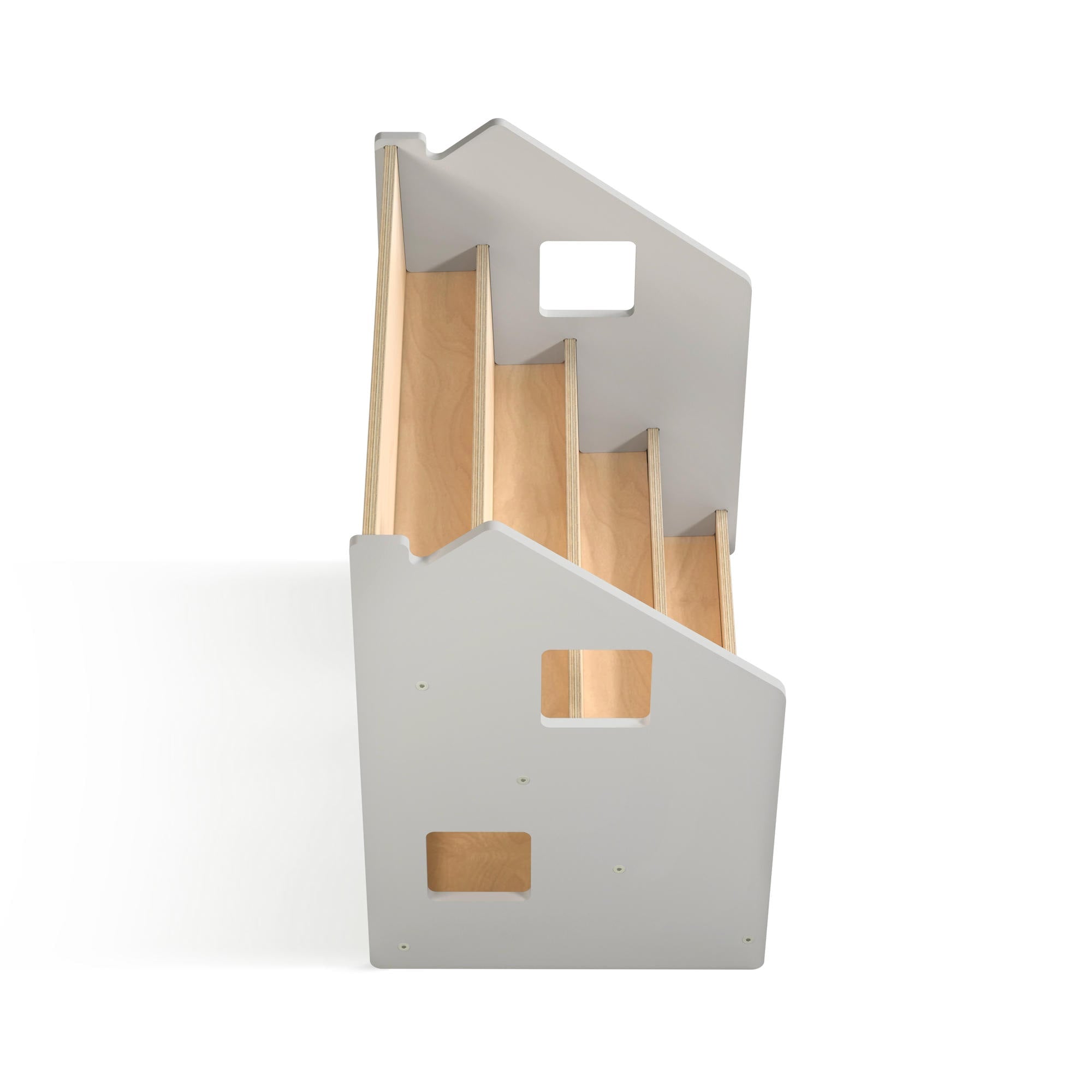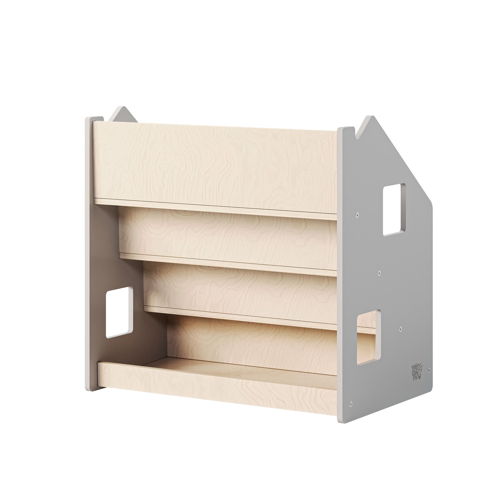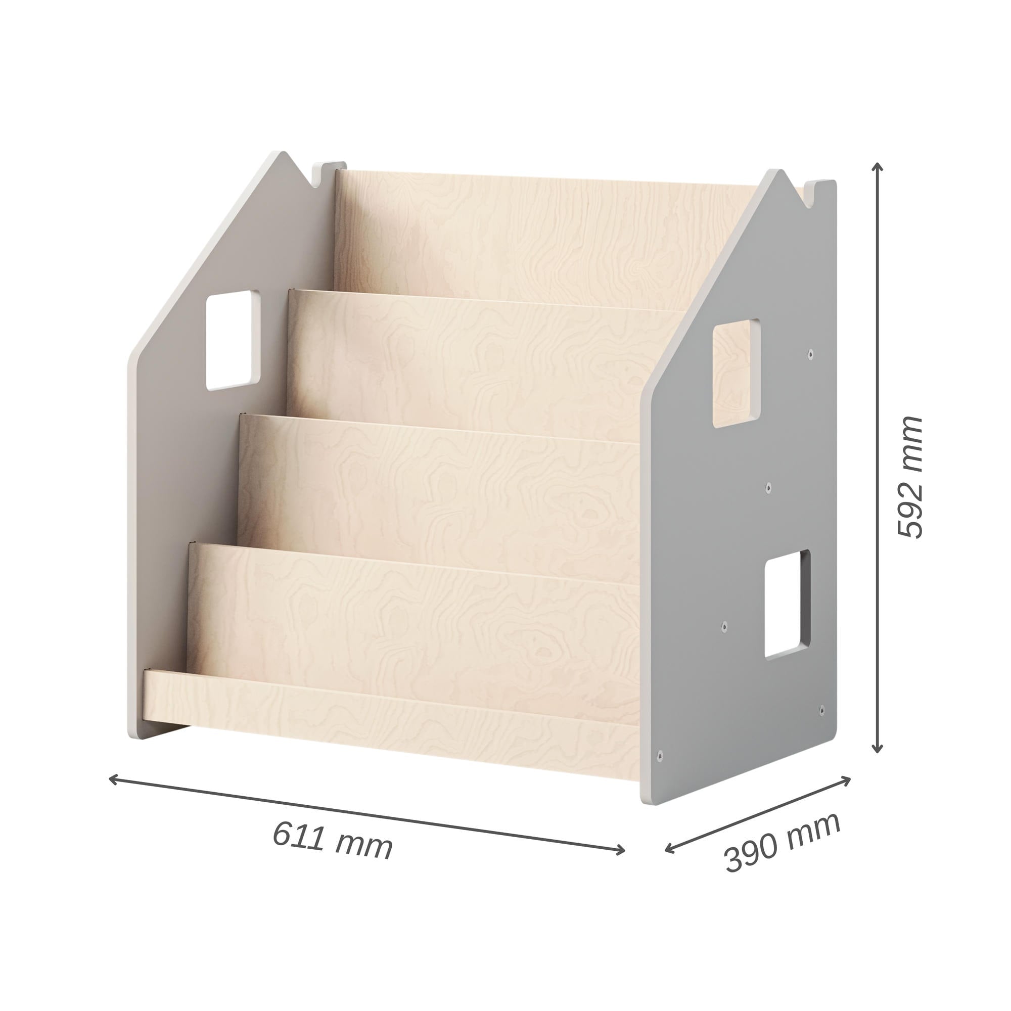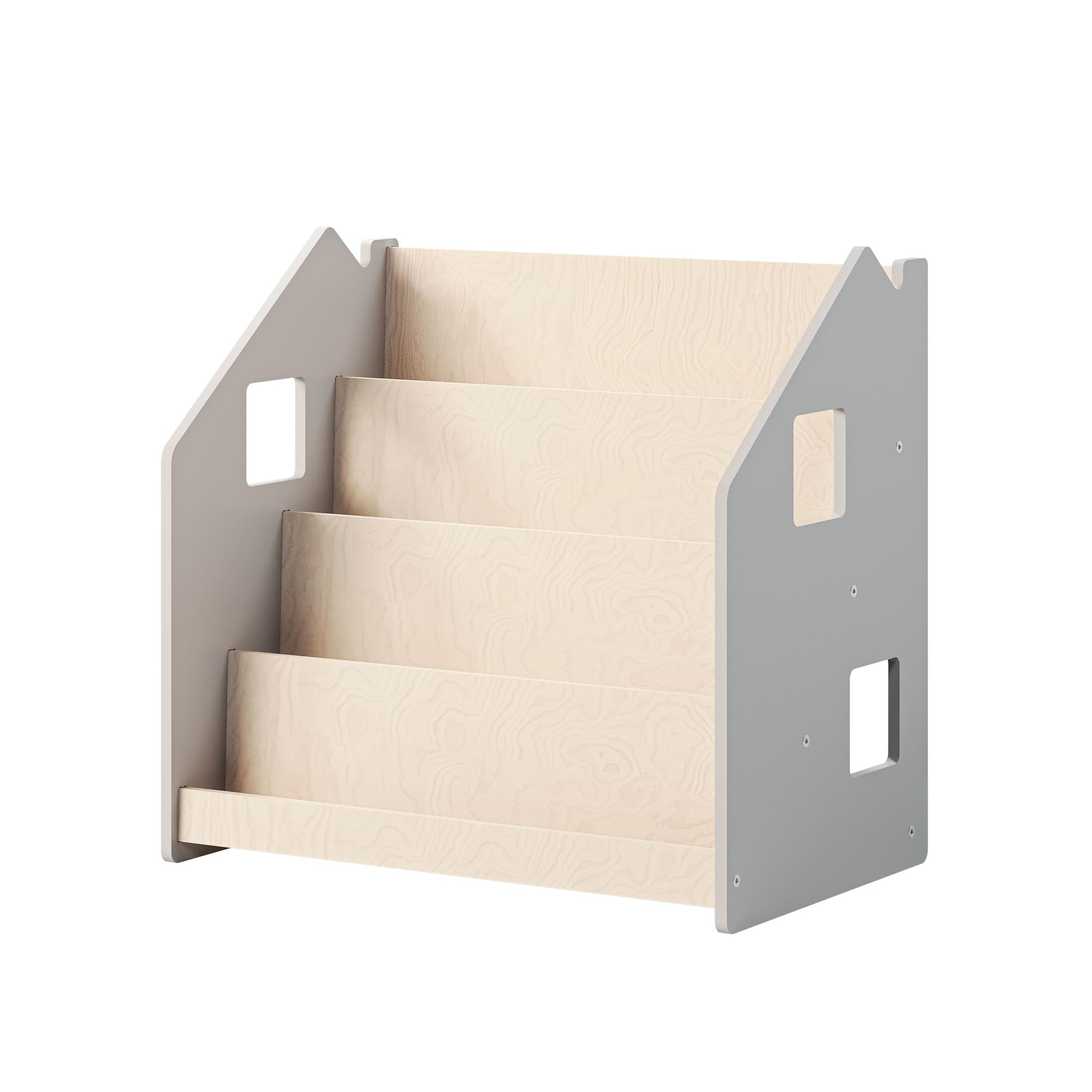 Police je prostorná se 4 regály a zadním úložným prostorem pro knihy nebo hračky. Díky viditelným obalům knih podporuje zájem o čtení. Minimalistický design se hodí do většiny interiérů, je vyrobena z lakované březové překližky, stabilní a bezpečná s zaoblenými hranami.