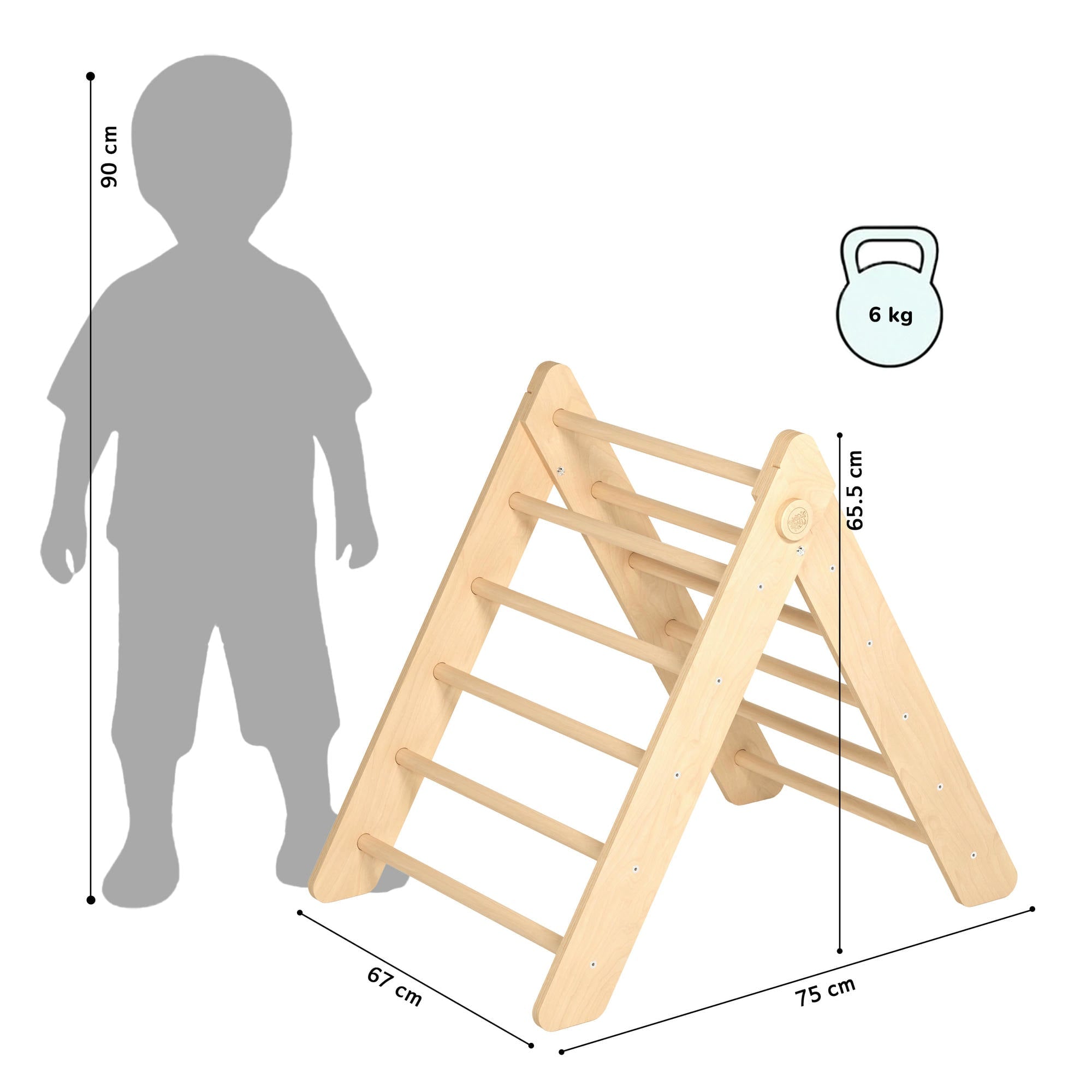 Všechny hrany jsou zaoblené, tyče pevně upevněny a trojúhelník obsahuje uzamykací zařízení proti pádu. Produkt je vhodný pro děti od 1 roku, dodává se rozebraný s pokyny a veškerým příslušenstvím k sestavení.