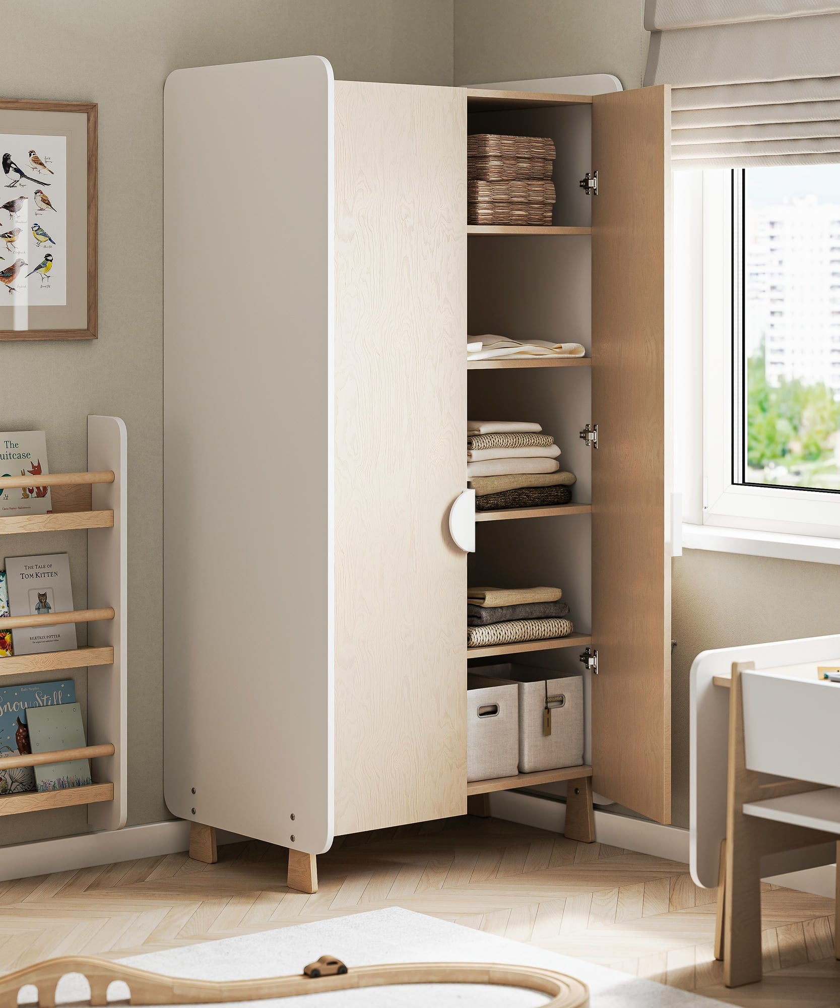 Kabinet Momo je dětská skříň, která pomáhá dětem učit se pořádek a samostatnost. Díky výšce přizpůsobené dětem mohou samy otevřít dvířka, vybrat si oblečení, složit ho a uložit zpět. Je to jednoduchý, ale důležitý krok k nezávislosti.