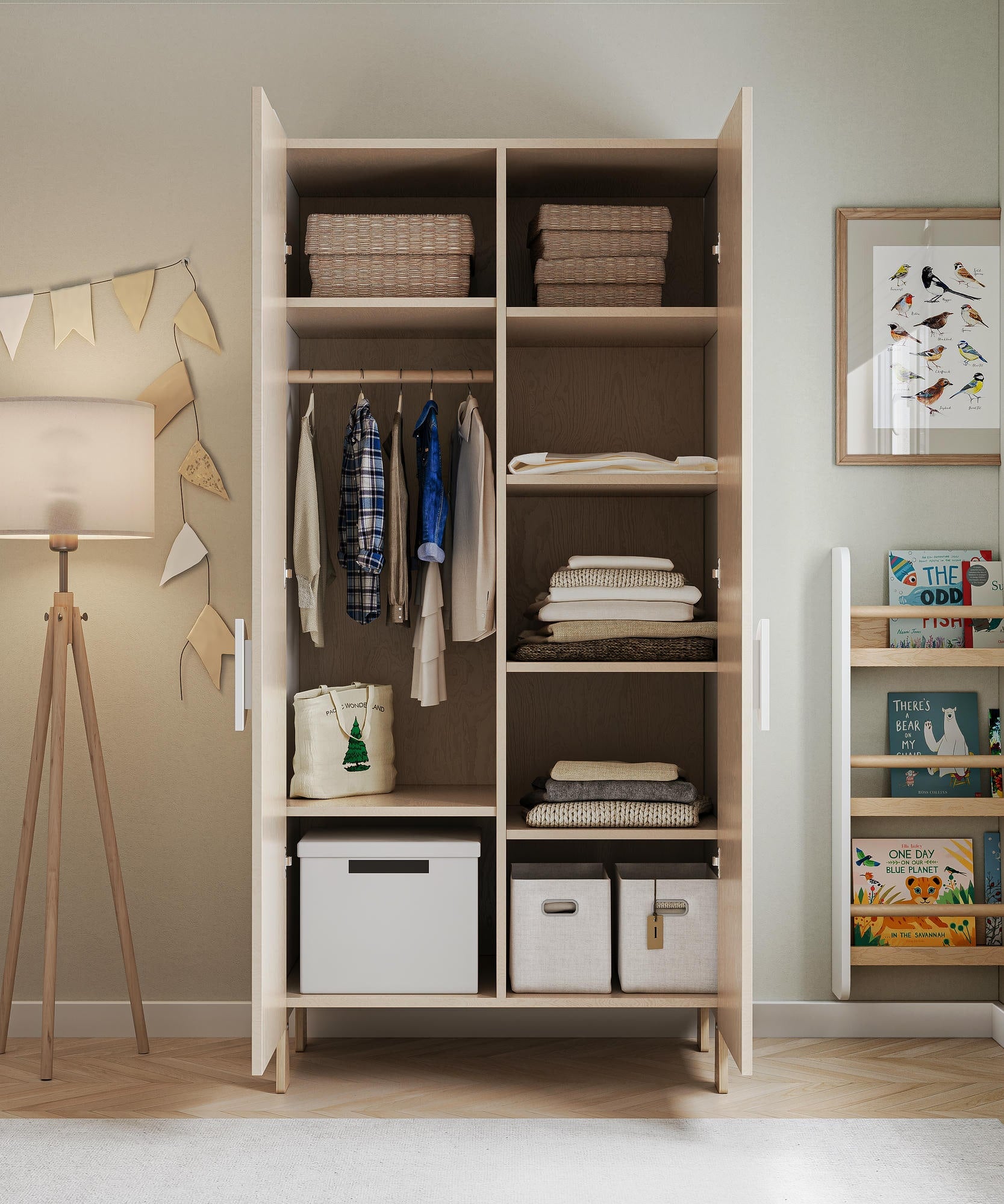 Skříň je kompaktní, ale uvnitř překvapivě prostorná. Hodí se do malých i větších pokojů a využijete ji na oblečení, ložní prádlo, hračky nebo sezónní doplňky.