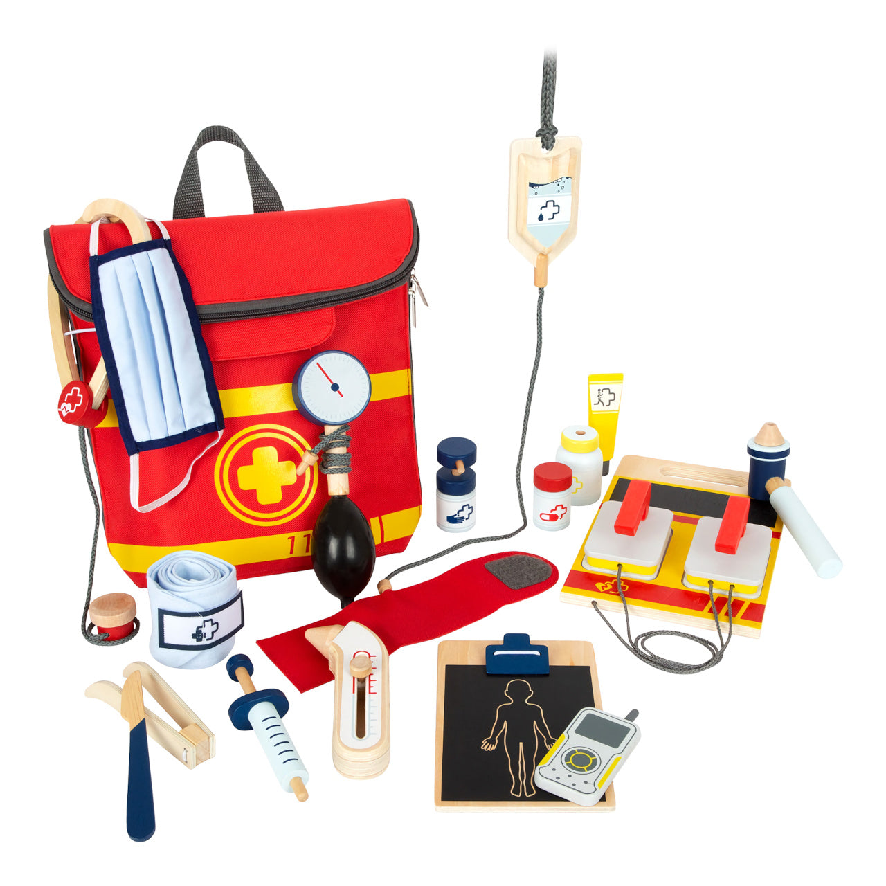 Vše pro naléhavé případy! Tento realistický batoh pro záchranáře má výrazné barvy, nastavitelné popruhy a mladí záchranáři v něm najdou všechny „opravdové“ lékařské pomůcky. Dvojitý zip a elastické kapsy uvnitř poskytují mnoho úložného prostoru a rychlý přístup k záchranářským nástrojům z pevného dřeva.