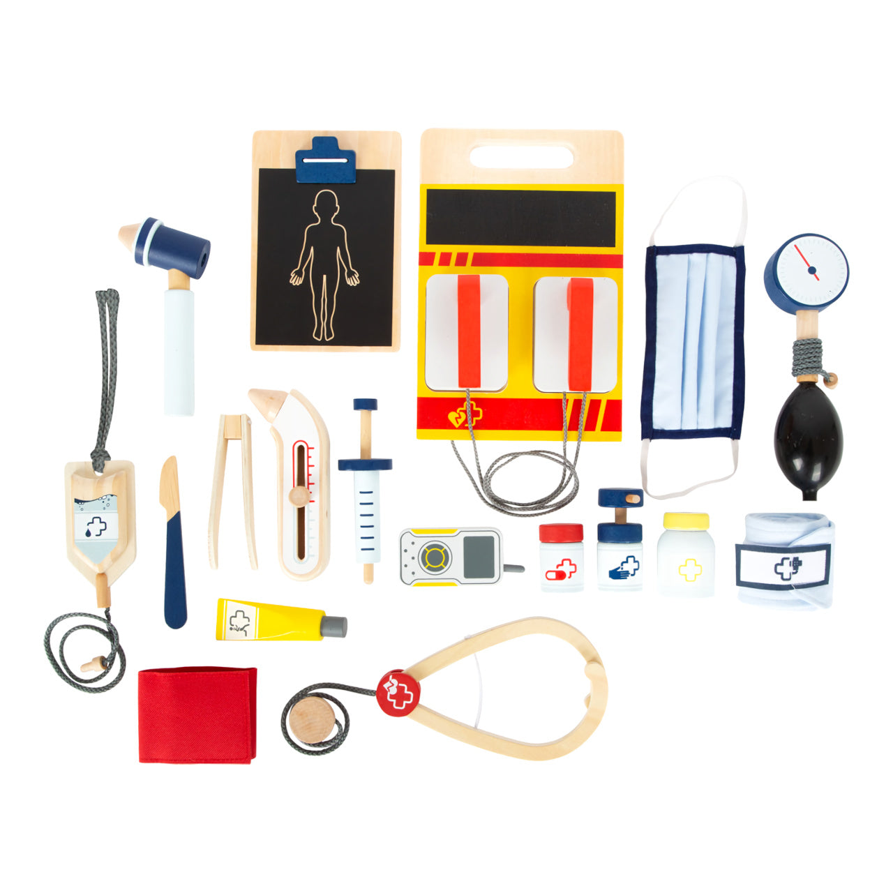 Nejzajímavější doplňky zahrnují tlakoměr s manžetou a balónkem, otoskop s lupou a defibrilátor s tabulkou pro křídu. Set obsahuje i teploměr, dětské textilní roušky, ampule s otvorem pro vložení stříkačky, dezinfekční sprej s pumpičkou, infúzi, náplasti na suchý zip, stetoskop, injekční stříkačku s pohyblivým mechanismem, skalpel, pinzetu a rádio. Díky těmto pevným hračkám si děti mohou hrát a objevovat práci záchranáře. Ilustrace na pomůckách usnadňují rozeznávání jednotlivých nástrojů a jejich použití.