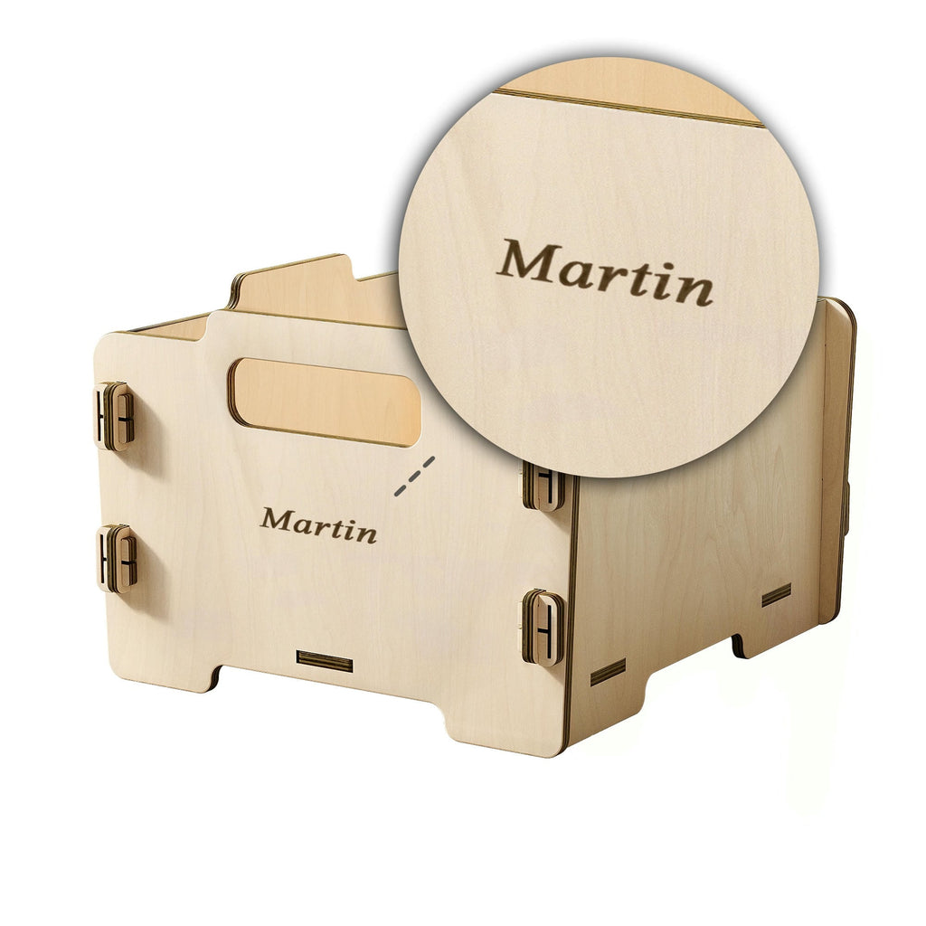Krabice je dodávána rozložená a lze ji snadno sestavit bez nářadí. Na přání je možná personalizace, díky níž se stane skutečně výjimečným doplňkem pro vaše dítě.
