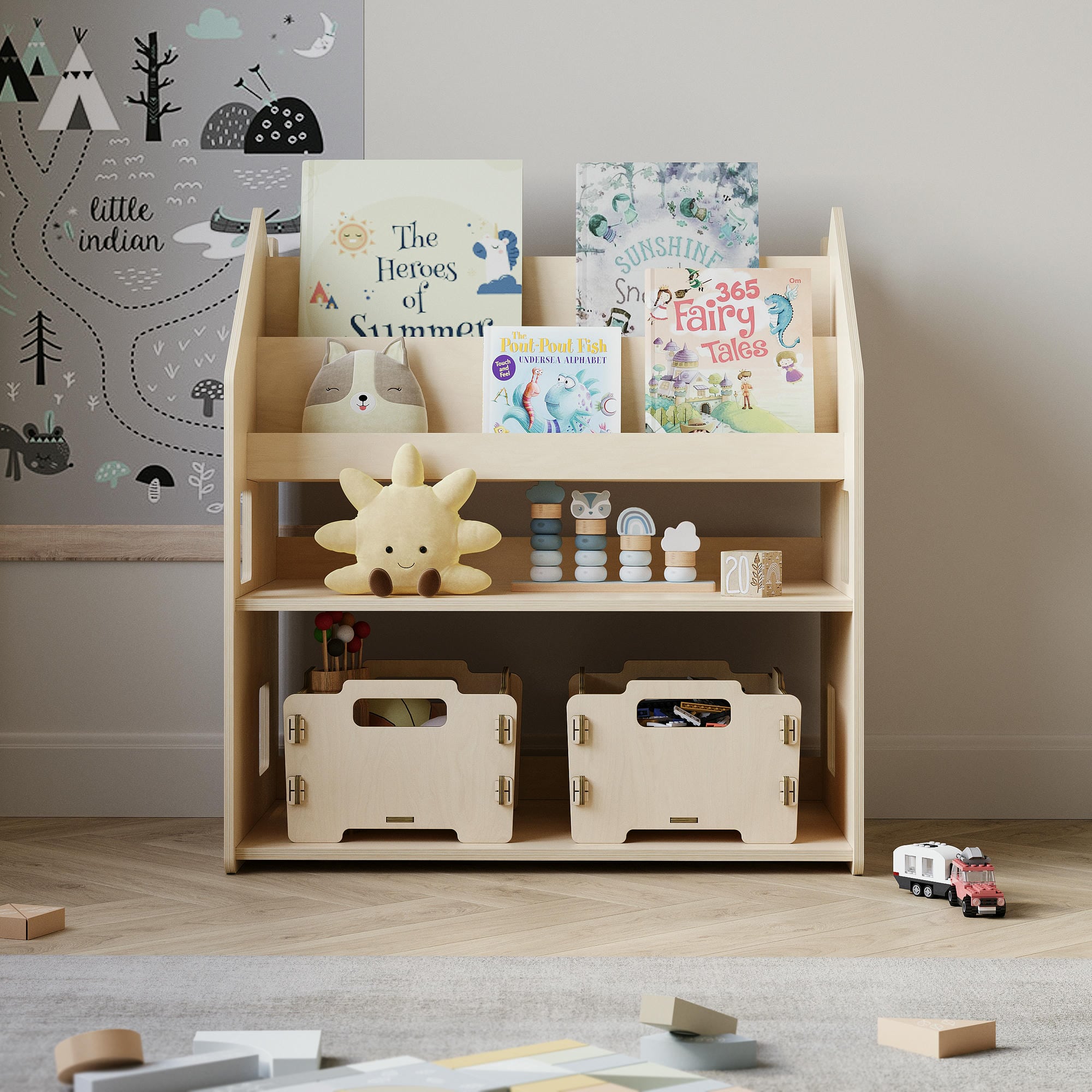 Sada obsahuje regál, montážní návod a nářadí. Police pomáhá dítěti rozvíjet organizační schopnosti a nezávislost podle Montessori principů, a zároveň slouží jako praktický a estetický doplněk dětského pokoje.