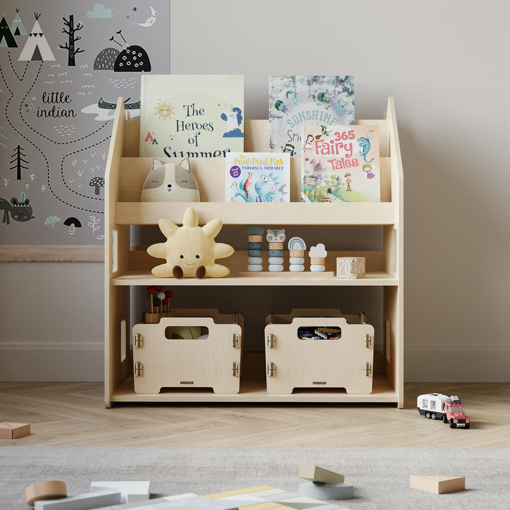 Představujeme Montessori regál 2 v 1, který podporuje samostatnost a pořádek u dětí. Děti si mohou samy vyndávat a ukládat knihy i hračky, přičemž obálky knih jsou dobře viditelné. Regál nabízí čtyři police a zadní úložný prostor, je vyroben z kvalitní lakované březové překližky, stabilní a bezpečný s oblými hranami.